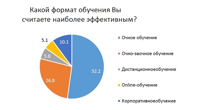 Наиболее эффективной формой обучения участники опроса считают традиционное очное обучение (52,2%), на втором месте – очно-заочное (26,8%).