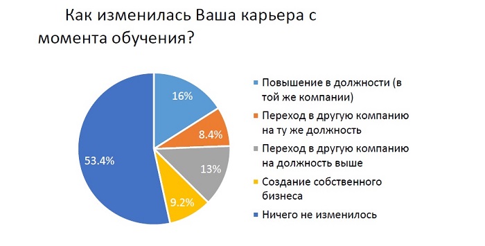 С момента обучения у 53,4% участников опроса не произошло никаких изменений. Однако 29% опрошенных все-таки получили повышение в должности (16% из них на своем месте работы, 13% – в новой компании), а 9,2% открыли собственный бизнес.