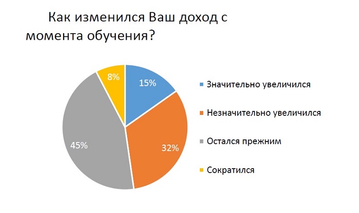 Увеличение своего дохода после обучения отмечают 47,8% респондентов: незначительное увеличение у 32,6% и серьезный рост у 15,2%. Однако есть и те, чей доход сократился – 7,6% опрошенных.